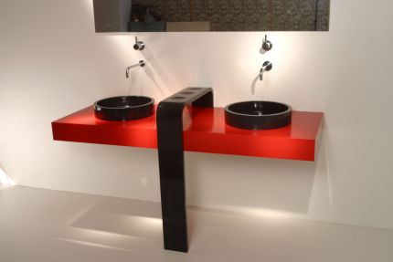 Seguendo lo stesso concetto di destrutturazione dei bacini di contenimento e delle pareti verticali che ha caratterizzato la vasca-doccia e Omega, il lavabo Alfa in Corian® colore Mandarin e colore Anthracite si sviluppa in larghezza (100 cm) e profondità (50 cm) più che in altezza (solo 25 cm). Più regolare pure la forma che si fa assumere alla lastra stampata di Corian®, prevedendo anche due appoggi laterali per gli oggetti.