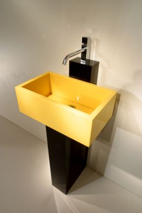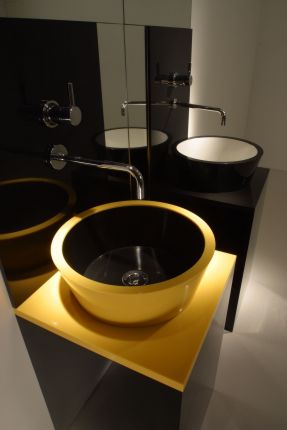 La scelta del colore (il giallo Lemon) sottolinea l’intento di sottolineare la natura "man-made" del materiale anche in un lavabo, la cui forma è quella del contenitore universale.