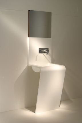 Un chiaro esempio di questo concetto è il lavabo "Silhouette", ispirato alla linearità delle creazioni di origami. La lastra di Corian® viene modellata a caldo formando l'alzata, quindi il piano con il lavello, per scendere quindi fino a terra rientrando, per lasciare spazio ai piedi. Le varianti di colore previste sono cinque: Glacier White (bianco ghiaccio), Hot (rosso acceso), Nocturne (nero), Sun (giallo), Adobe (color cuoio).
