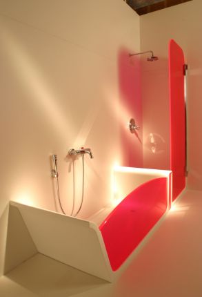 È particolarmente scenografica la vasca con box doccia realizzata con un’unica lastra di Corian® (nelle varianti Glaciar White e Lilac) da 2 cm, che dal piatto doccia si rialza per creare un passaggio/divisorio/seduta per poi riabbassarsi a formare la vasca con una parete laterale inclinata per l’appoggio della schiena. Il concetto di bacino che forma la vasca è stato destrutturato, facendo nascere i pezzi dall’incrocio di due superfici estranee: la conca di contenimento in Corian®, che forma la linea orizzontale, e la parete frontale di chiusura in metacrilato rosa fluorescente, che costituisce la linea verticale.