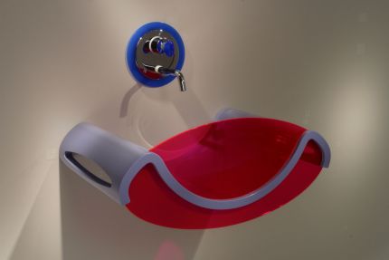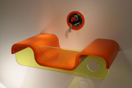 Ancora più evidente la destrutturazione del concetto di bacino che forma il lavabo "Omega" dove lo spessore di Corian® (2 cm) nei colori Lilac (viola) e Anthracite, è ben visibile frontalmente con l'inserimento del pannello ovale di metacrilato (giallo o rosa fluorescente), e lateralmente, dove sono state realizzate due aperture ovali per appendere le salviette.